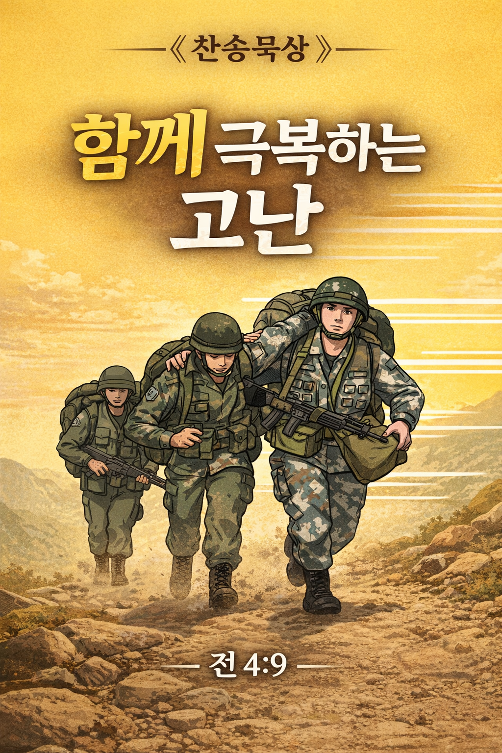 등을 밀어 주며 함께 걷는 전우들.